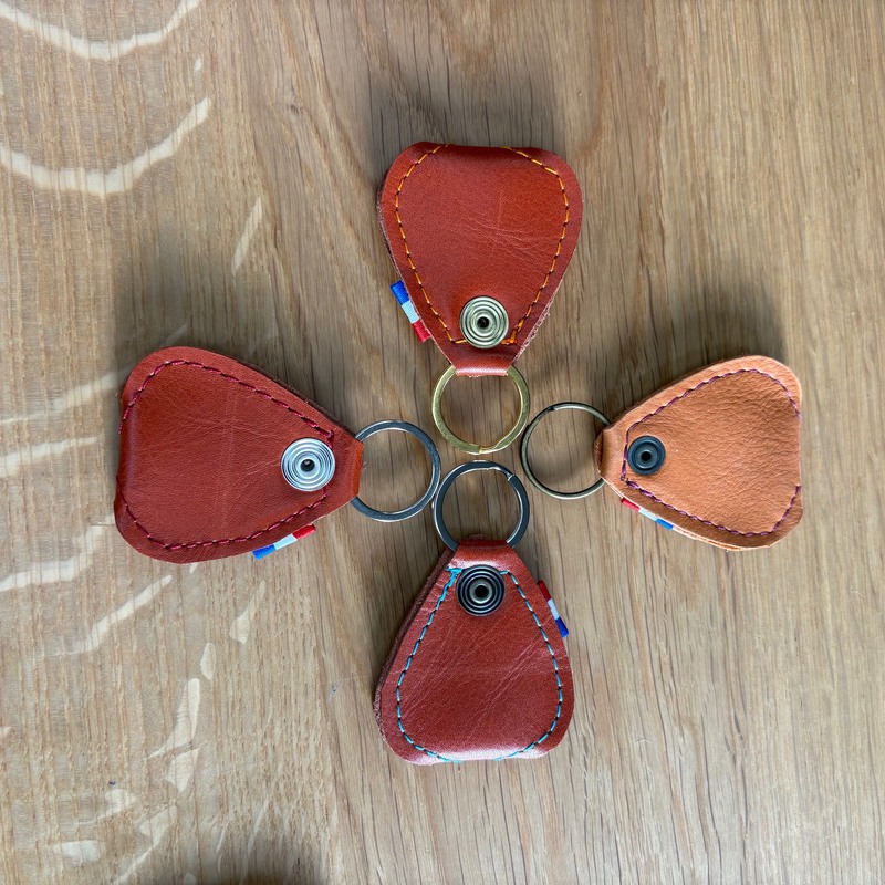 Fabriqués à la main en Bretagne dans notre atelier, ces porte-clés / porte-médiators en cuir sont conçus à partir de chutes de cuir soigneusement sélectionnées (chèvre, agneau, vachettes fantaisie…). Une manière élégante de valoriser les matières premières tout en limitant le gaspillage.