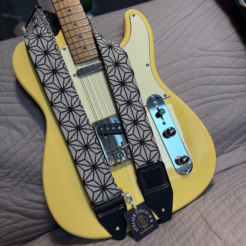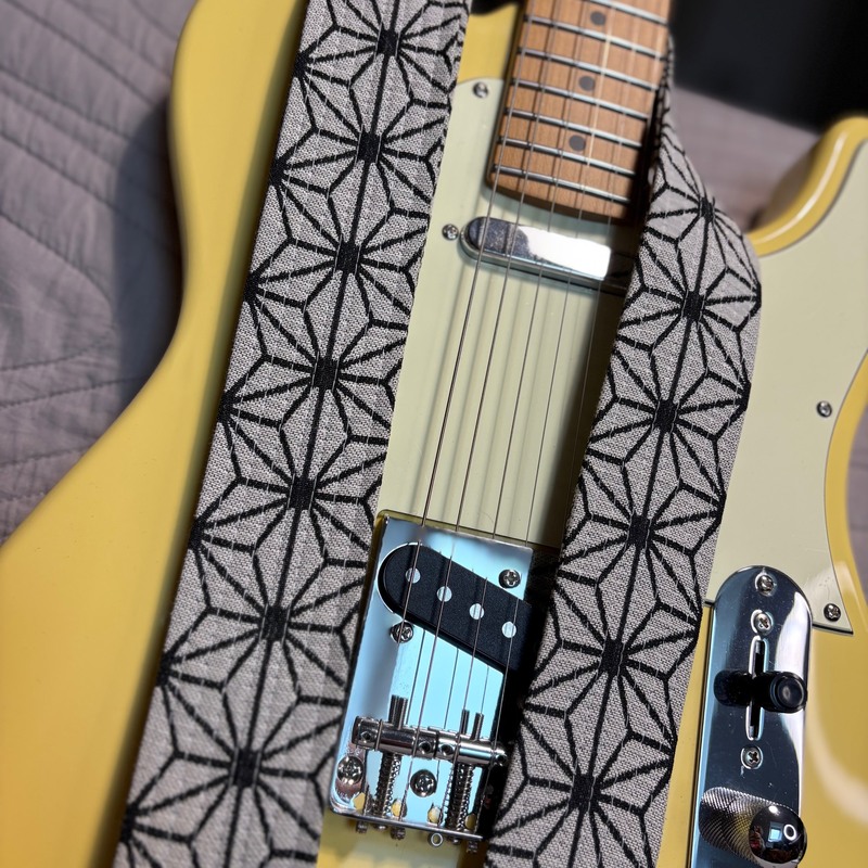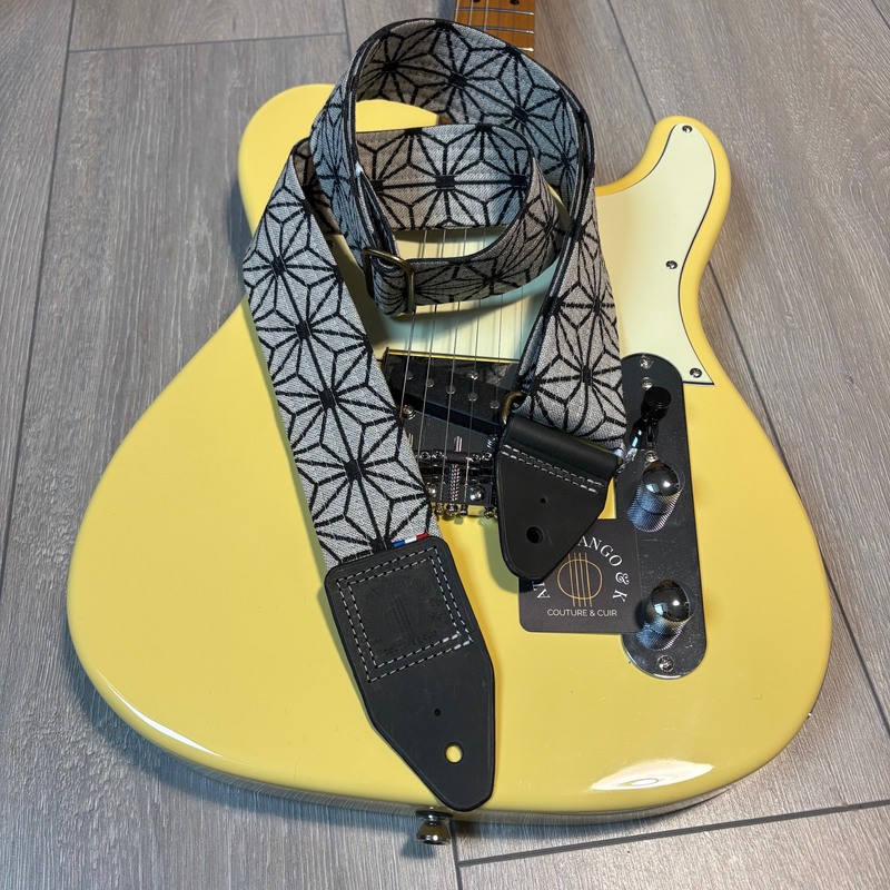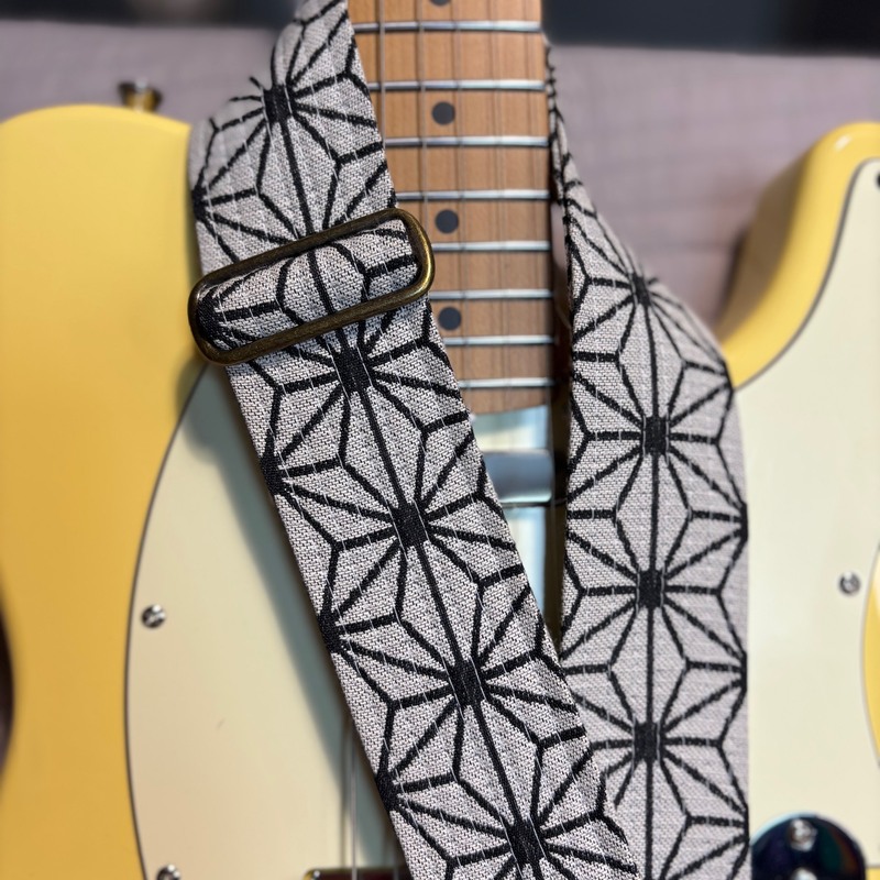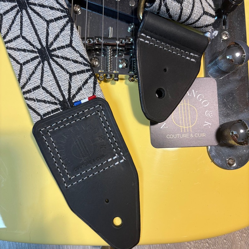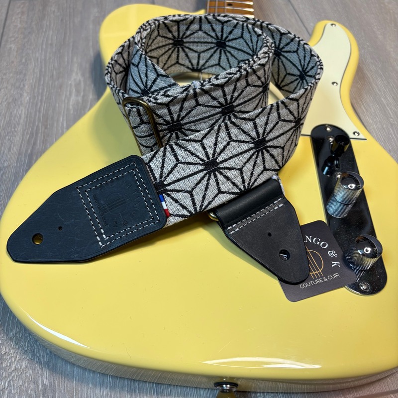 Cette sangle de guitare artisanale est réalisée en tissu japonais. Graphique et intemporelle, elle joue avec le contraste du noir et du blanc, comme une partition où chaque étoile pourrait devenir une note.