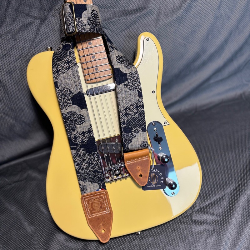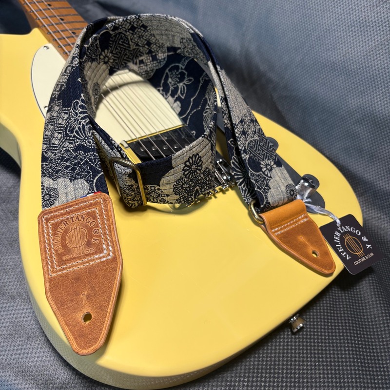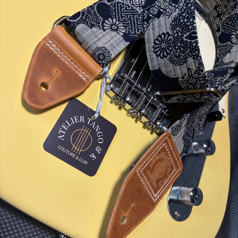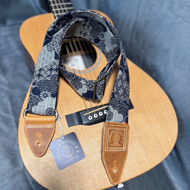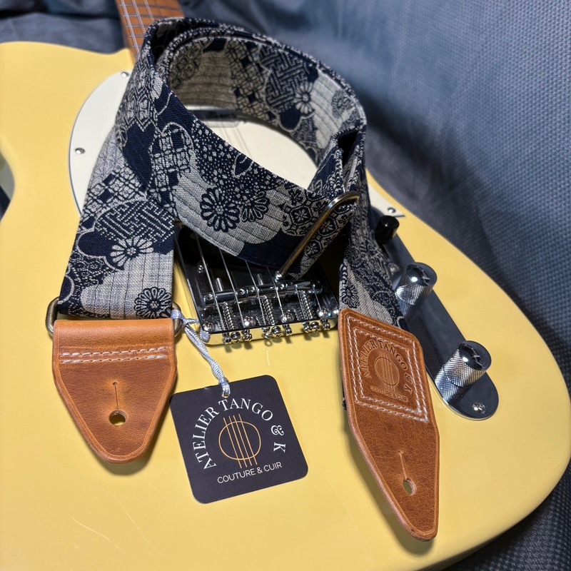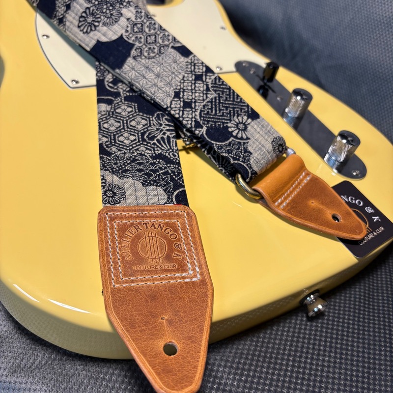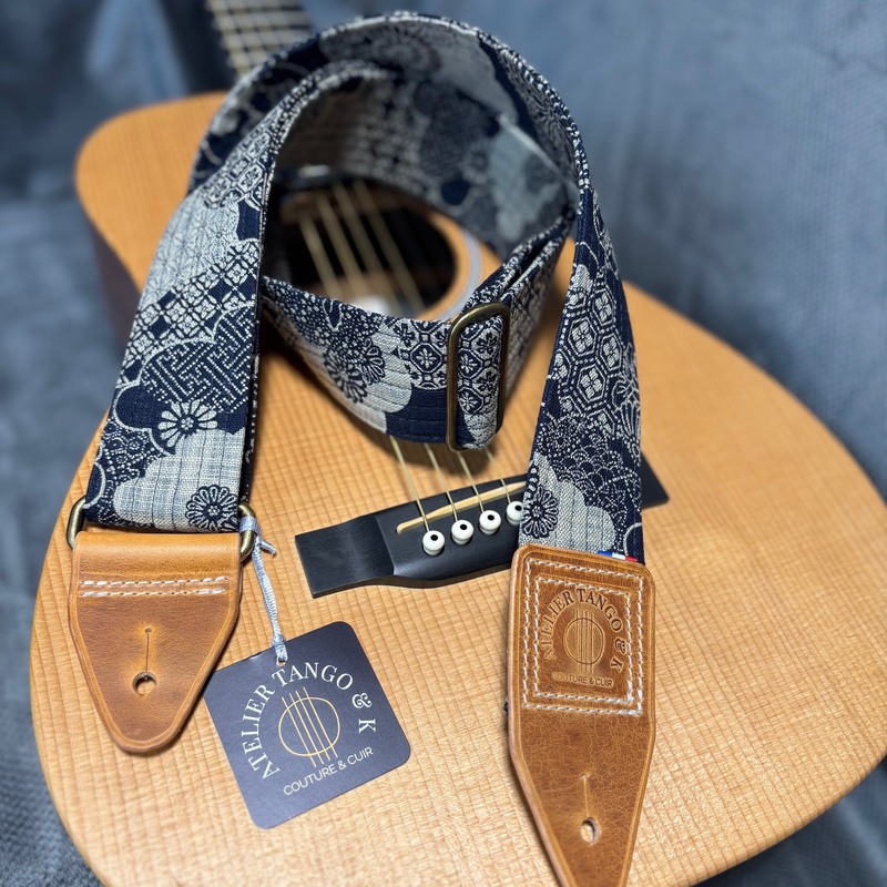 Le contraste entre l’indigo profond et l’écru naturel donne à cette sangle de guitare un style à la fois sobre, graphique et intemporel. Les motifs traditionnels japonais s’entrelacent avec finesse, créant une composition harmonieuse, presque méditative.